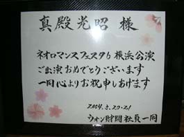 春らしく桜の花を散したカードに一筆添えさせていただきました。看板の名前と同じ「ウォン財閥社員一同」を採用。